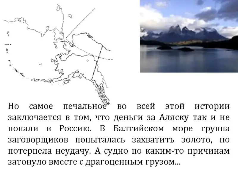 Но самое печальное во всей этой истории заключается в том, что деньги за Аляску так и не попали в Россию. В Балтийском море группа заговорщиков попыталась захватить золото, но потерпела неудачу. А судно по каким-то причинам затонуло вместе с драгоценным грузом...