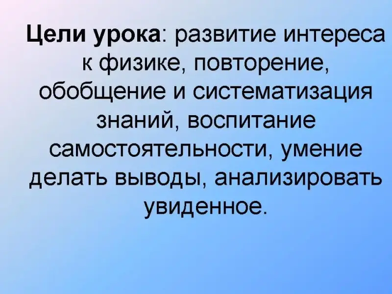Цели урока: развитие интереса к физике, повторение, обобщение и систематизация знаний, воспитание самостоятельности, умение делать выводы, анализировать увиденное.