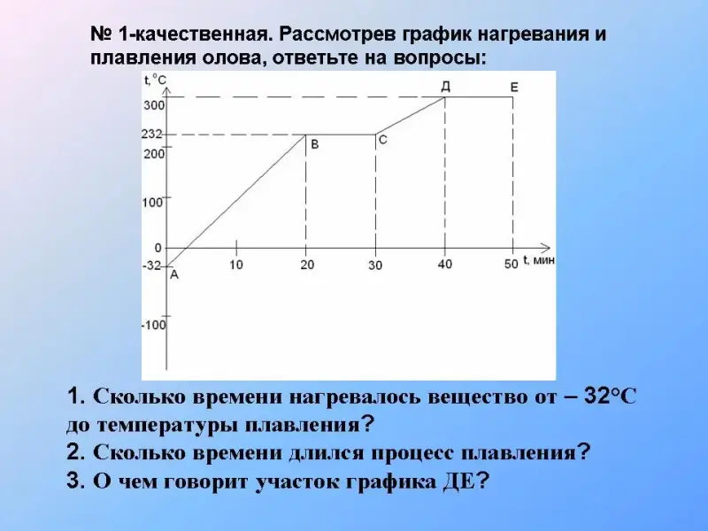 № 1-качественная. Рассмотрев график нагревания и плавления олова, ответьте на вопросы: