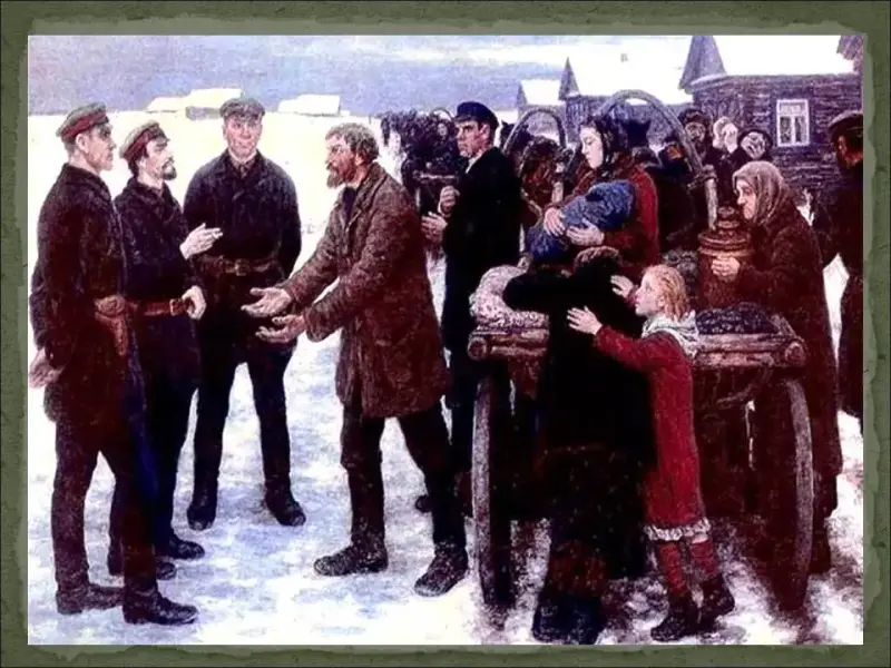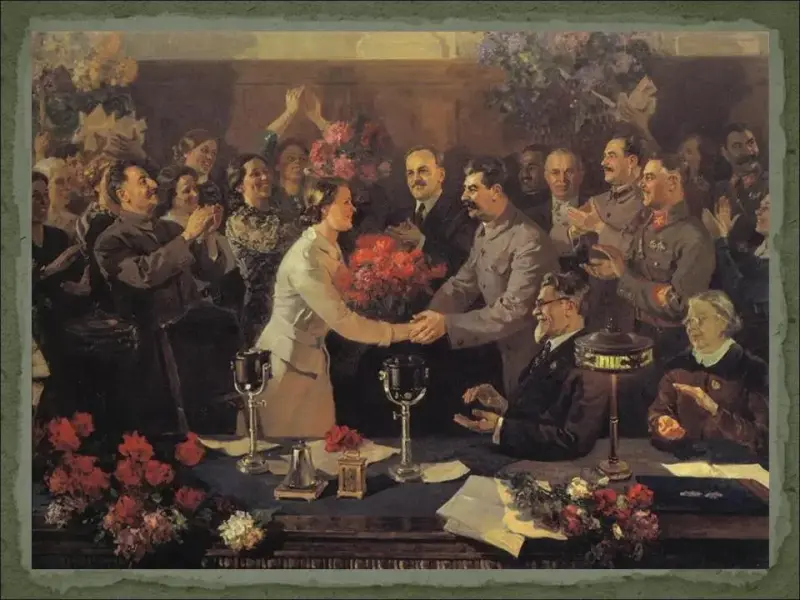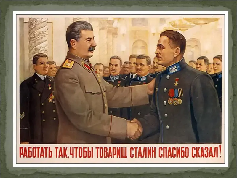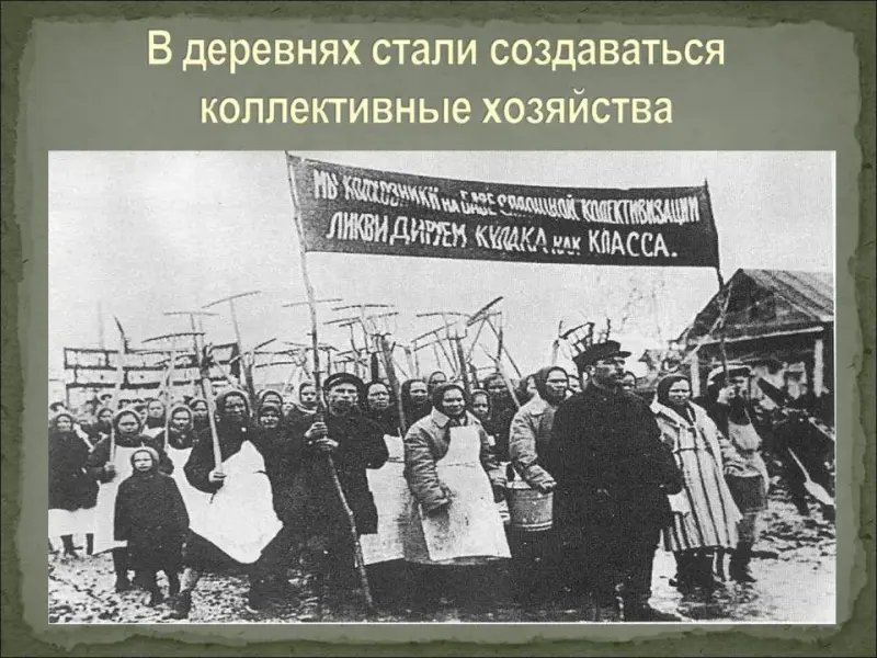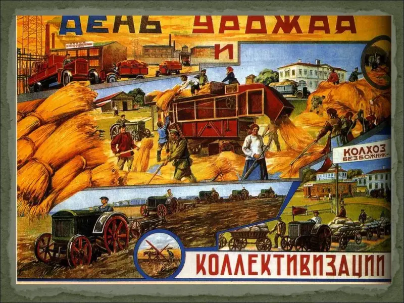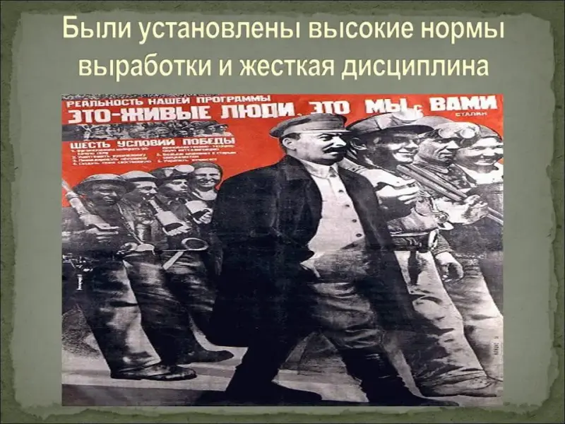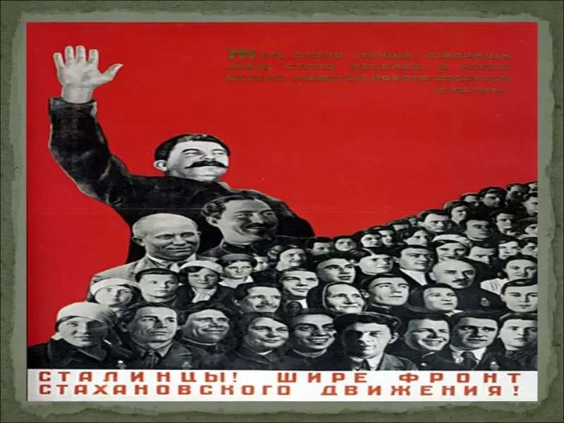 - Несмотря на утверждения коммунистической пропаганды, положение рабочих оставалось очень тяжелым, а положение крестьян было просто катастрофическим (отсутствие твердой зарплаты, больничных, пенсий, работа за трудодни, то есть "за палочки", введение паспортной системы, которая превратила крестьян в колхозных крепостных, практически военная дисциплина в колхозах).
