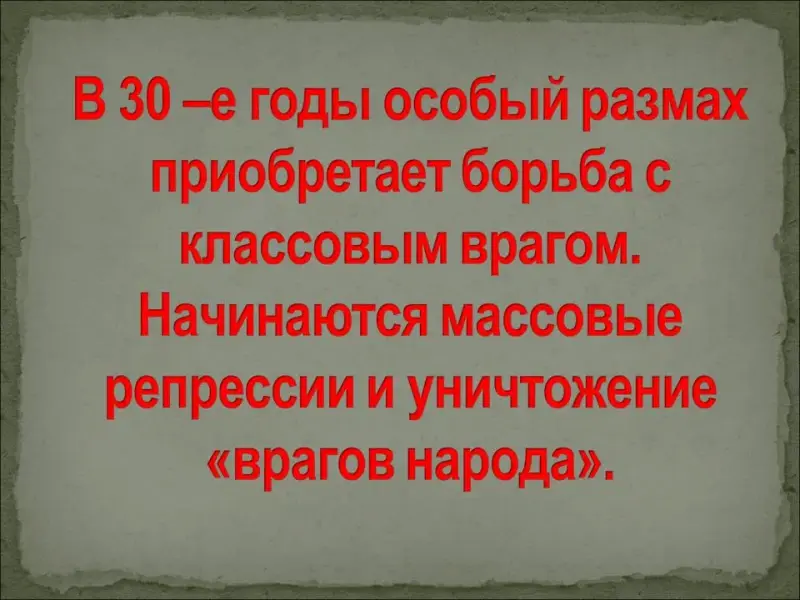 С конца 20-х годов масштабы политических репрессий начали стремительно возрастать. Сталин выдвинул тезис о неизбежности обострения классовой борьбы в стране в ходе строительство социализма.