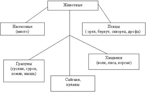(Из копытных типичны виды, отличающиеся острым зрением и способностями к быстрому бегу (антилопы); из грызунов - строящие сложные норы (суслики, сурки, слепыши) и прыгающие виды (тушканчики, кенгуровые крысы). Большая часть птиц на зиму улетает. Обычны: степной орел, дрофа, степной лунь, степная пустельга, жаворонки. Многочисленны пресмыкающиеся и насекомые.)