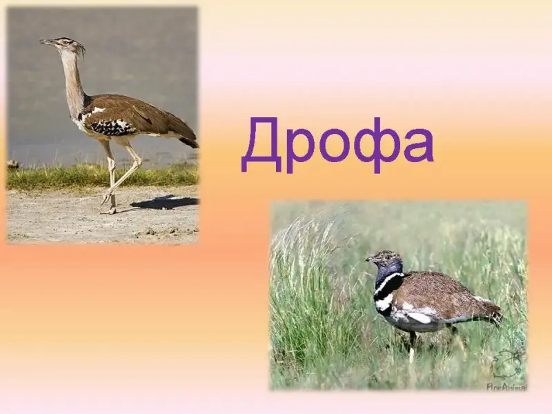 В отдаленных от поселений местах сохранилась большая степная птица дрофа. Она около метра высотой, с длинными ногами, плохо летает. Эта редкая птица охраняется законом. Она занесена в Красную книгу. (Антилопа сайгак, степной орел.)