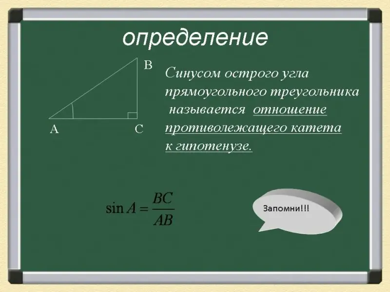 Синусом острого угла прямоугольного треугольника называется отношение противолежащего катета к гипотенузе.