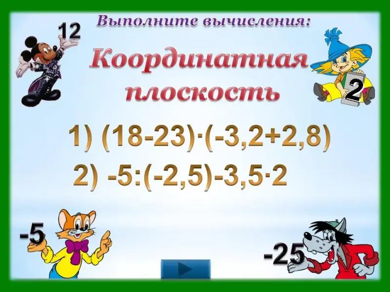 Учащиеся находят значения выражений и, нажимая на 2 и -5 появляется тема урока "Координатная плоскость".