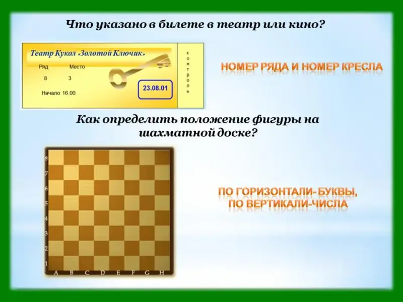 Слайд 4. Что указано в билете в театр или кино? (Номер ряда и номер кресла).