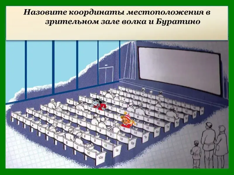 Слайд 5. Назовите координаты местоположения в зрительном зале волка и Буратино. (Т.к. волк сидит в кресле №5, то его координаты (5;6), а Буратино (9;7))