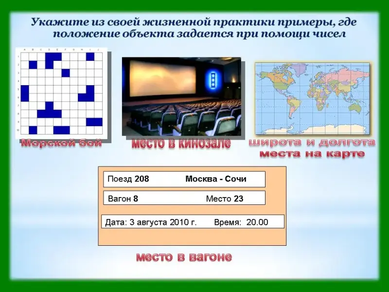 Слайд 6. Системы координат встречаются в нашей жизни постоянно. Укажите из своей жизненной практики примеры, где положение объекта задается при помощи чисел. Системы координат пронизывают всю практическую жизнь человека. Кроме почтовых адресов и номеров телефонов, вы знакомы с системой координат в зрительном зале кинотеатра (номер ряда и номер места), в поезде (номер вагона и номер места), с системой географических координат (долгота и широта).