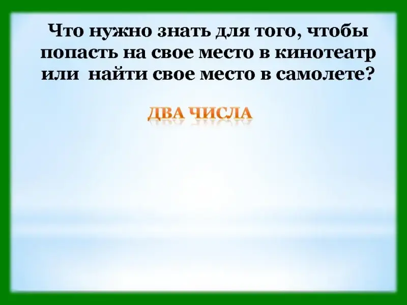 Слайд 7. Что нужно знать для того, чтобы попасть на свое место в кинотеатр или найти свое место в самолете? (Два числа.)