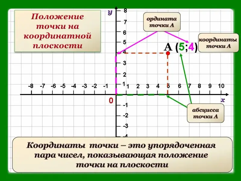 Определение: Координаты точки - это упорядоченная пара чисел, показывающая положение точки на плоскости.