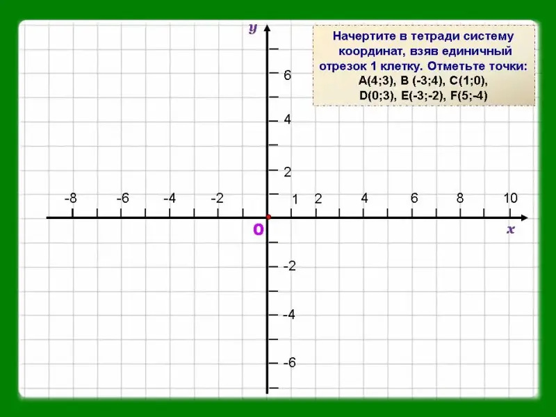 Слайд 12.Один ученик у доски, остальные учащиеся в тетрадях. Начертите в тетради систему координат, взяв единичный отрезок 1 клетку. Отметьте точки: