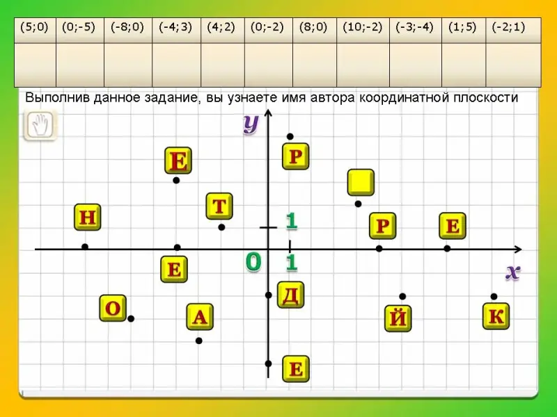 Слайд 13. Выполнив данное задание, вы узнаете имя автора координатной плоскости. Один ученик у доски перетаскивает буквы, соответствующие координатам точки в таблицу. Получится: Рене Декарт.