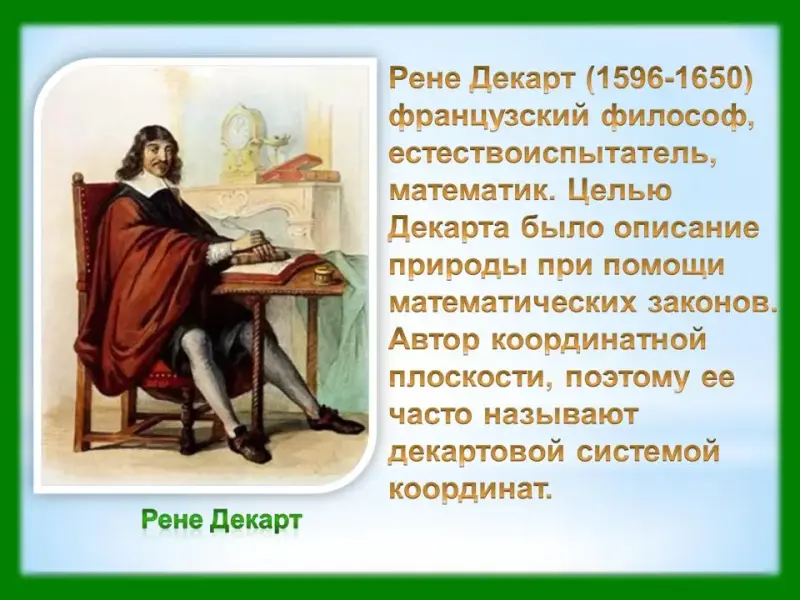 Слайд 14. Немного истории. Рене Декарт (1596-1650) французский философ, естествоиспытатель, математик. Целью Декарта было описание природы при помощи математических законов. Автор координатной плоскости, поэтому ее часто называют декартовой системой координат.