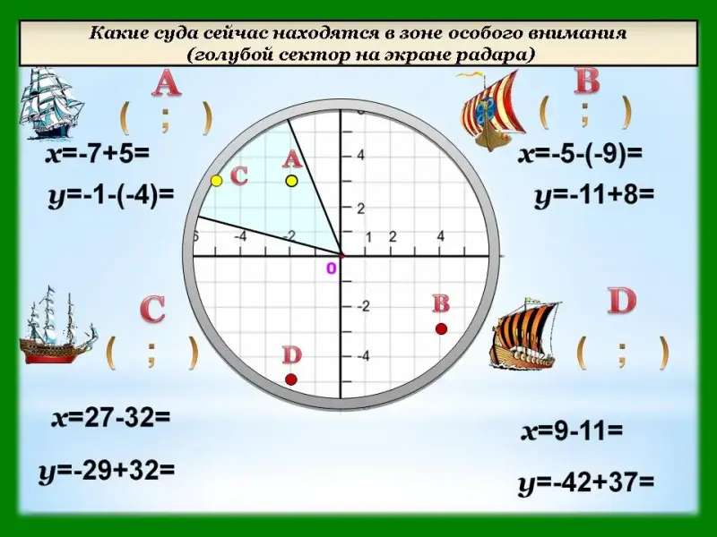Слайд 15. Какие суда сейчас находятся в зоне особого внимания (голубой сектор на экране радара)? Возле каждого корабля расположены координаты, записанные в виде выражений на действия с положительными и отрицательными числами. Учащиеся должны сначала найти координаты точек, а затем построить эти точки на координатной плоскости и определить, лежат ли внутри выделенного сектора или нет.