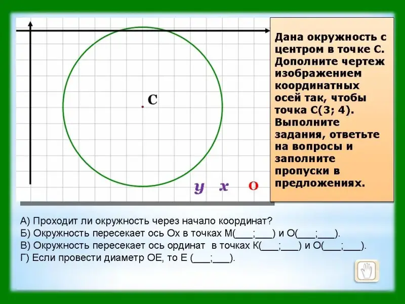 В) Окружность пересекает ось ординат в точках К(___;___) и О(___;___).