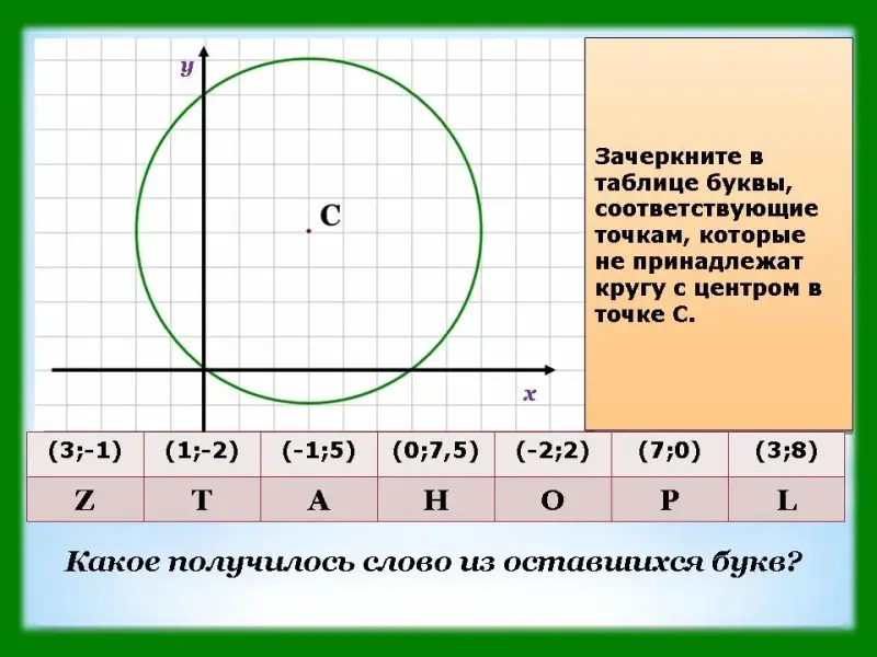 Слайд 18. Зачеркните в таблице буквы, соответствующие точкам, которые не принадлежат кругу с центром в точке С.