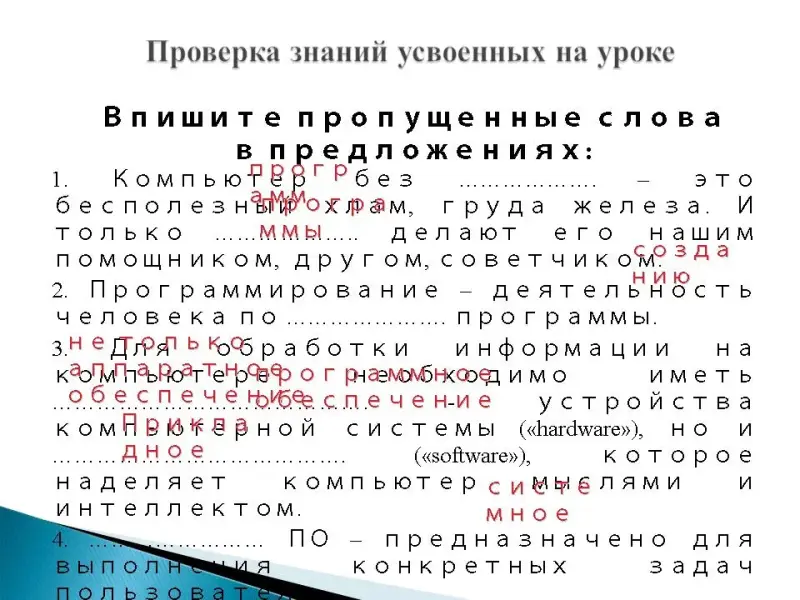 3. Все используемые в компьютере программы называются аппаратным обеспечением (программным обеспечением).