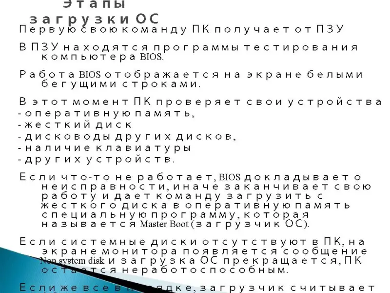 Если что-то не работает, BIOS докладывает о неисправности, иначе заканчивает свою работу и дает команду загрузить с жесткого диска в оперативную память специальную программу.