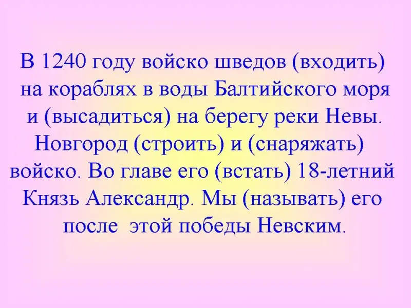В 1240 году войско шведов (входить) на кораблях в воды Балтийского моря и (высадиться) на берегу реки Невы. Новгород (строить) и (снаряжать) войско. Во главе его (встать) 18-летний князь Александр. Мы (называть) его после этой победы Невским.