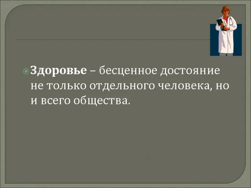 Здоровье - бесценное достояние не только отдельного человека, но и всего общества. Это должен понимать каждый. При встречах, расставаниях с близкими и дорогими людьми мы желаем им крепкого здоровья, так как это - основное условие и залог полноценной и счастливой жизни.