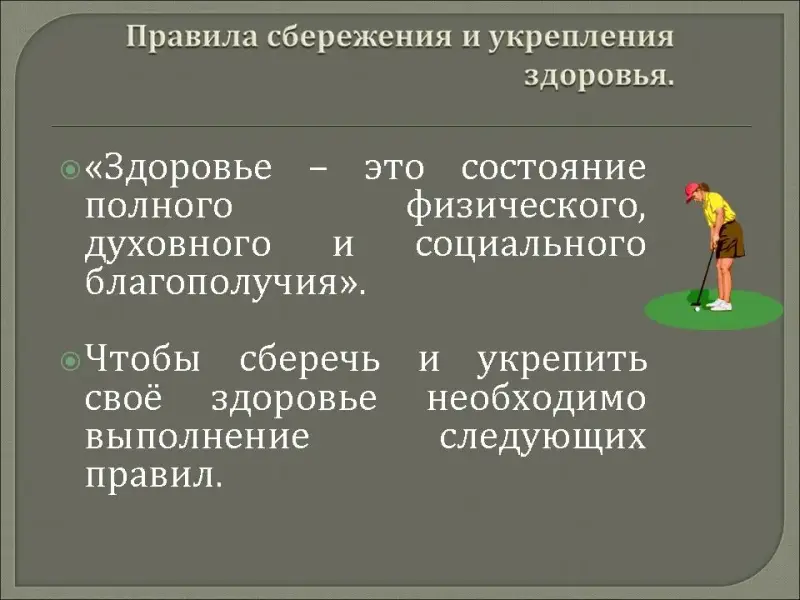 По определению Всемирной Организации Здравоохранения «Здоровье - это состояние полного физического, духовного и социального благополучия». Чтобы сберечь и укрепить своё здоровье необходимо выполнение следующих правил.