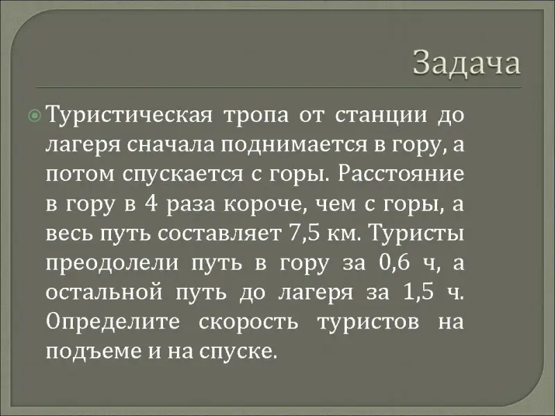 Туристическая тропа от станции до лагеря сначала поднимается в гору, а потом спускается с горы. Расстояние в гору в 4 раза короче, чем с горы, а весь путь составляет 7,5 км. Туристы преодолели путь в гору за 0,6 ч, а остальной путь до лагеря за 1,5 ч. Определите скорость туристов на подъеме и на спуске.