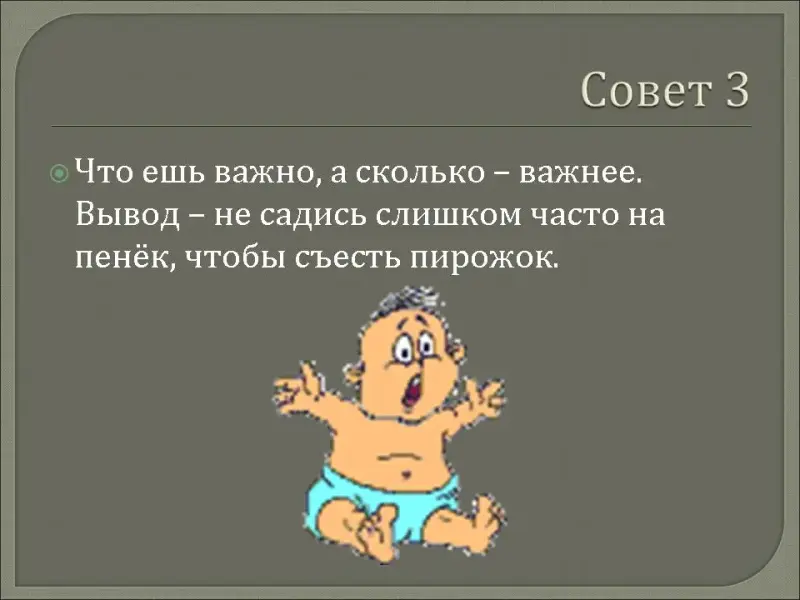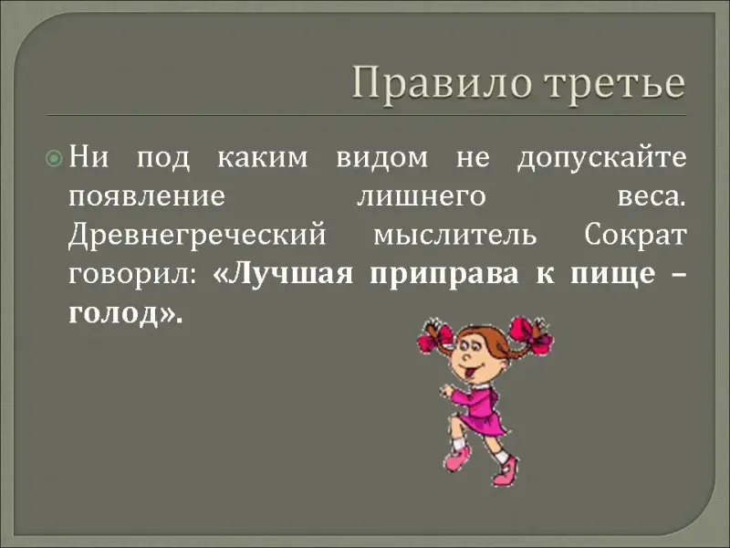 Ни под каким видом не допускайте появление лишнего веса. Древнегреческий мыслитель Сократ говорил: «Лучшая приправа к пище - голод». Сегодня учёными и целителями доказано, что голодом возможно лечить многие заболевания. Избыточный вес приводит к ослаблению организма, уменьшению срока жизни.