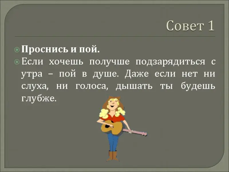 Проснись и пой. Если хочешь получше подзарядиться с утра - пой в душе. Даже если нет ни слуха, ни голоса, дышать ты будешь глубже.