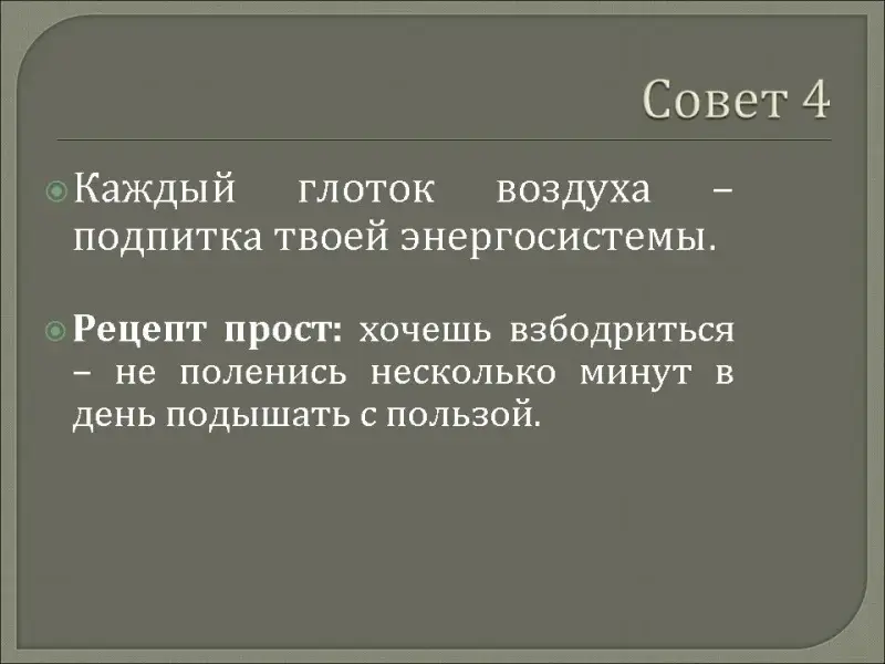 Каждый глоток воздуха - подпитка твоей энергосистемы.