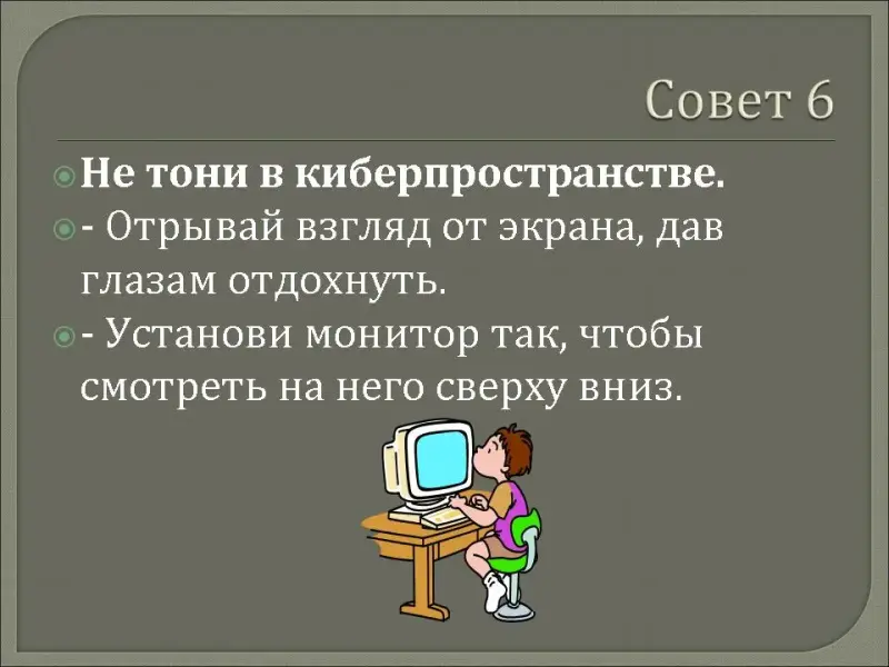 - Отрывай взгляд от экрана, дав глазам отдохнуть.