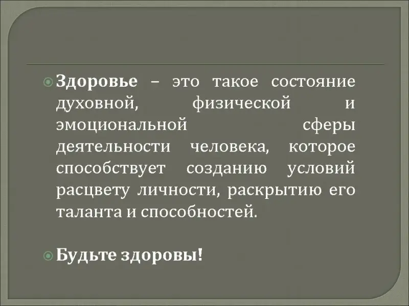 Здоровье - это такое состояние духовной, физической и эмоциональной сферы деятельности человека, которое способствует созданию условий расцвету личности, раскрытию его таланта и способностей, осознанию им своей неразрывной связи с окружающим миром, своей ответственности за себя и своё окружение.