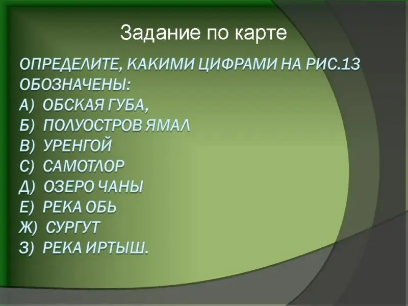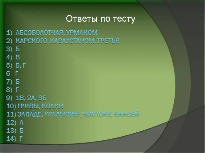 - На партах у учащихся карточки с тестом и картой по прошлой теме - Западная Сибирь, на которые они отвечают. Затем меняются с соседом по парте и проверяют у друг друга (ответы на слайде № 2).