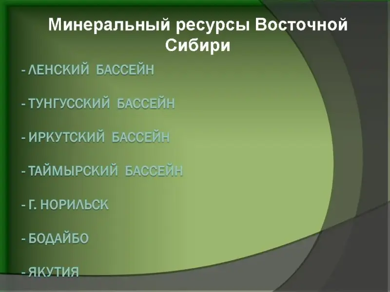 Этот регион весьма разнообразен полезными ископаемыми. Особенно богаты недра Восточной Сибири каменным углем. Их запасы составляют почти 70% общероссийских. Здесь расположены угленосные бассейны - Ленский, Тунгусский, Иркутский, Таймырский и другие. Большое значение имеют металлические полезные ископаемые. В районе г. Норильска имеются медно-никелевые руды, образование которых связано с трапповым магматизмом. В Забайкалье - центр Бодайбо - добывают золото. Особое значение имеют месторождения алмазов. Также большое значение в хозяйстве имеют графит, каменная соль и т.д. (слайд-шоу № 25, 26, 27, 28).