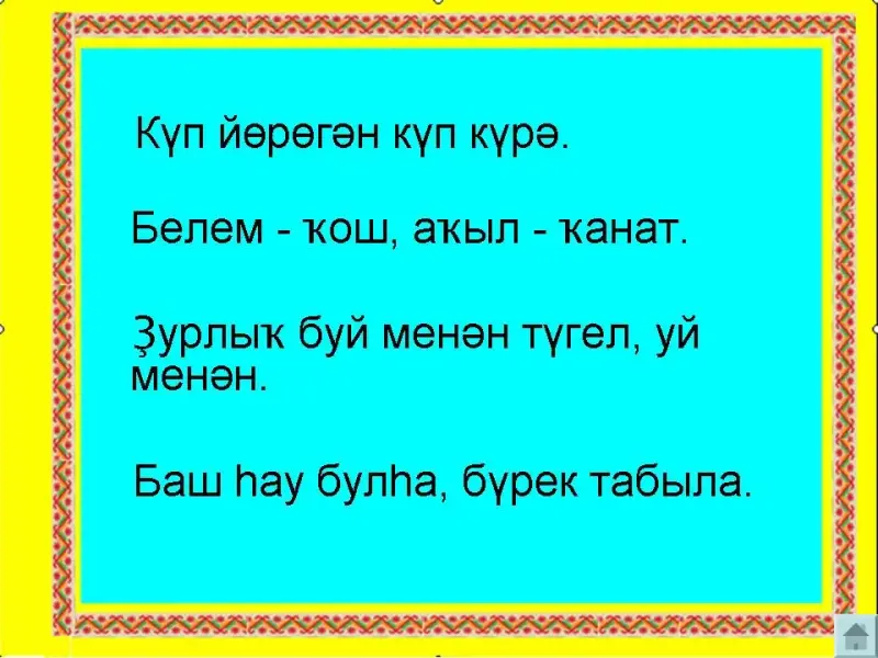 Эти и другие пословицы перекликаются по смыслу с пословицами русского и марийского народа. Вот мы все знаем пословицы. Но пословицы - это не просто наша речь. Пословицы ловко, красиво построены, они часто даже складными бывают, как стихи. Существует очень много пословиц на разные темы. В пословицах выражен характер народа, его ум, наблюдение над жизнью. Прочитайте башкирские народные пословицы, переведенные на русский язык, и попытайтесь объяснить их значение: (слайд)