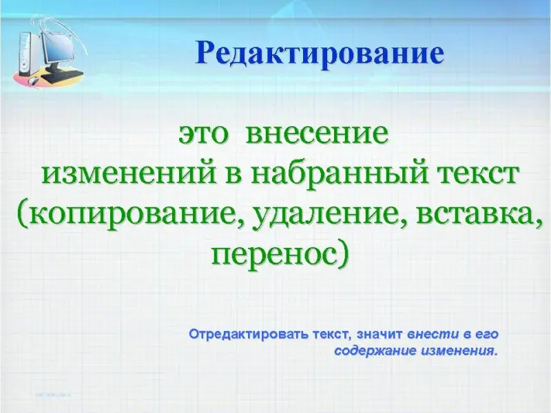 Запишите, пожалуйста, определение: редактирование текста - это действия по исправлению ошибок и изменению содержания компьютерного текста.