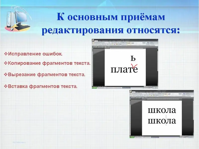 Как же воспользоваться этим правилом на практике? например, чтобы вставить пропущенные буквы, необходимо щелкнуть левой кнопкой мыши на месте вставки и ввести недостающие буквы, нажимая соответствующие клавиши на клавиатуре. Чтобы стереть лишний символ, щелкните левой кнопкой мыши за удаляемым символом и нажмите клавишу Backspace. Чтобы перевести курсор на новую строку, щелкните левой кнопкой мыши в конец имеющейся строки и нажмите клавишу Enter.