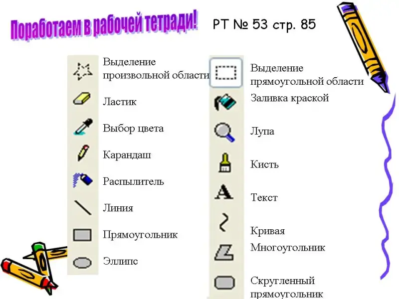 Учитель: В графическом редакторе PAINT возможно работать с типовым набором элементов. Все они собраны в панели инструментов (на экране демонстрируется слайд №6 панель инструментов). Откройте рабочие тетради стр.85 задание №53 и подпишите кнопки панели инструментов.
