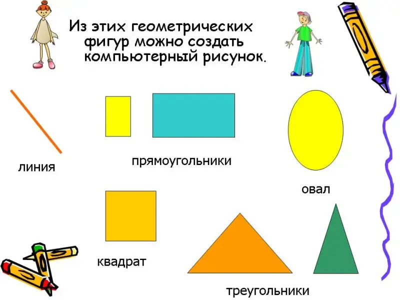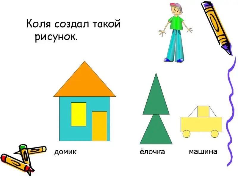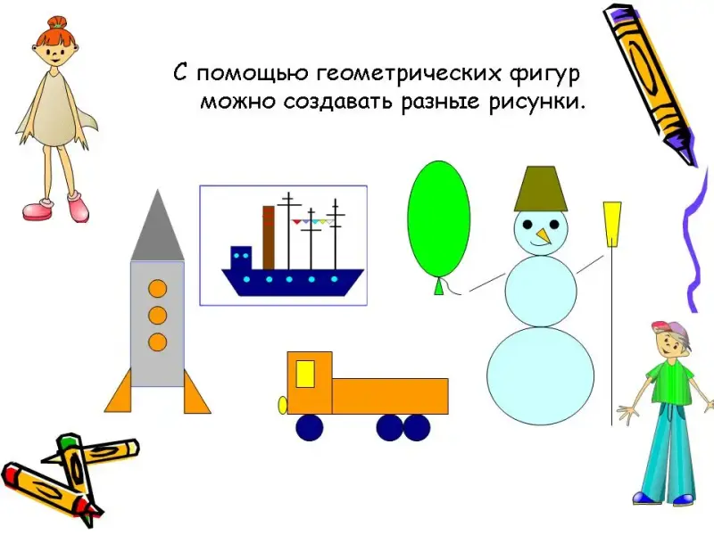 После выполнения свободного рисования учитель предлагает учащимся составить рисунок с помощью геометрических фигур.