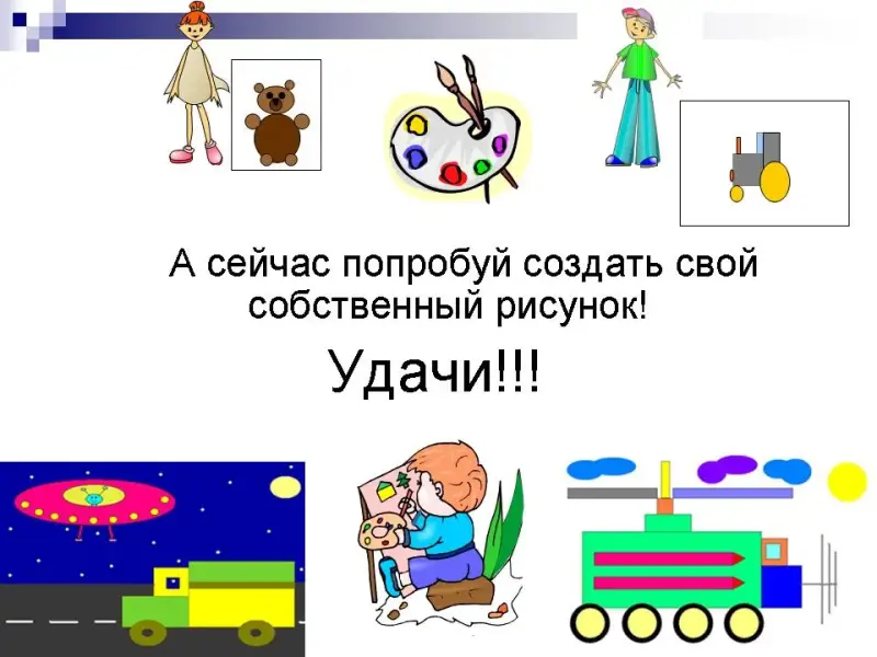 Учитель: Ну а теперь вы займетесь творчеством и попробуете сами составить рисунок. (Cлайд № 13, презентация к уроку)