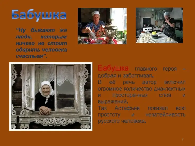 "Последний поклон" - это разговор о детстве и о тех людях, которые согрели это детство теплом своего сердца и лаской своих трудовых рук, заронив в душу его семя живительных исканий".