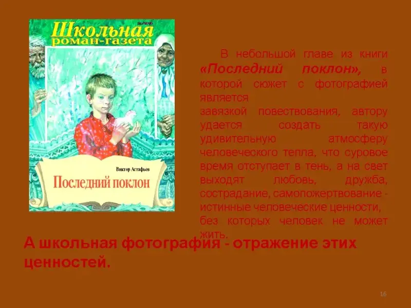 Учитель. В повести В.П.Астафьева "Последний поклон" рассказывается о том, как мальчик познаёт мир, свою малую родину, как осознает, что любит её, как становится личностью. А ещё эта повесть о старших, о тех людях, которые готовили мальчика к сложной взрослой жизни.
