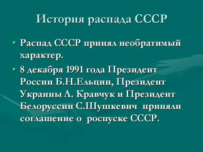 - 8 декабря 1991 года Президент России Б.Н.Ельцин, Президент Украины Л. Кравчук и Президент Белоруссии С.Шушкевич приняли соглашение о роспуске СССР.