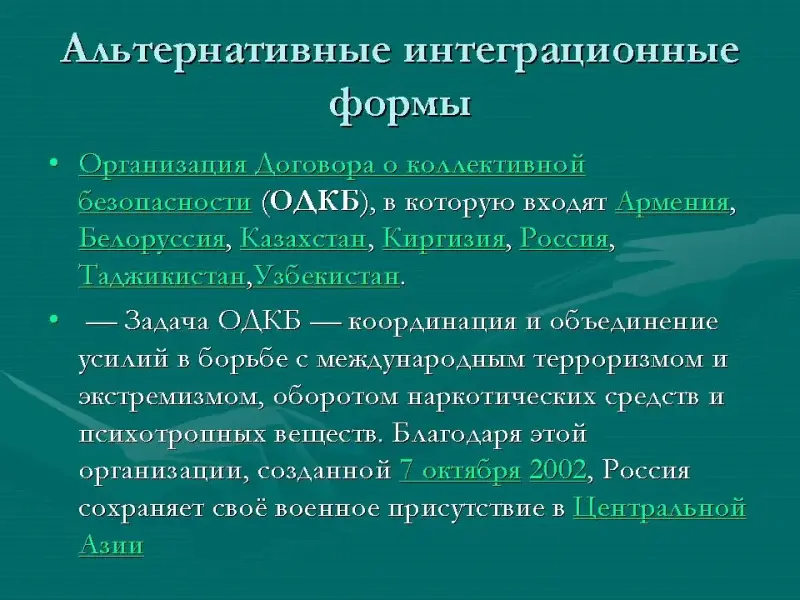 - Задача ОДКБ - координация и объединение усилий в борьбе с международным терроризмом и экстремизмом, оборотом наркотических средств и психотропных веществ. Благодаря этой организации, созданной 7 октября 2002, Россия сохраняет своё военное присутствие в Центральной Азии.