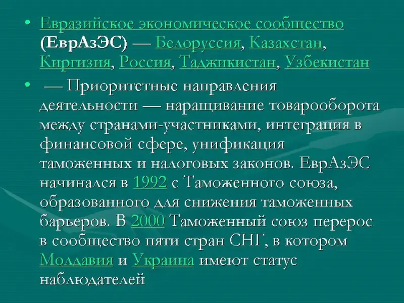 - Приоритетные направления деятельности - наращивание товарооборота между странами-участниками, интеграция в финансовой сфере, унификация таможенных и налоговых законов. ЕврАзЭС начинался в 1992 с Таможенного союза, образованного для снижения таможенных барьеров. В 2000 Таможенный союз перерос в сообщество пяти стран СНГ, в котором Молдавия и Украина имеют статус наблюдателей.