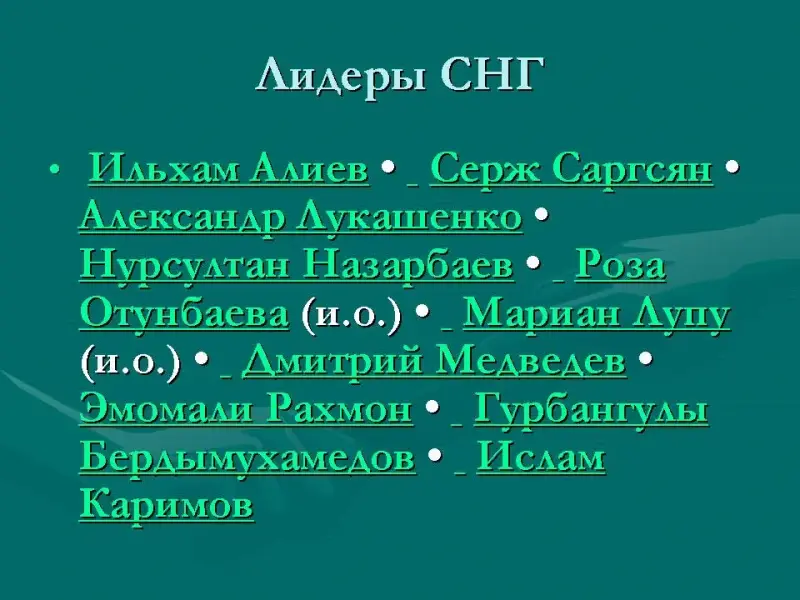 Учитель: А знаете ли вы лидеров СНГ? (Учитель называет фамилию главы государства, а учащиеся называют государства или наоборот)