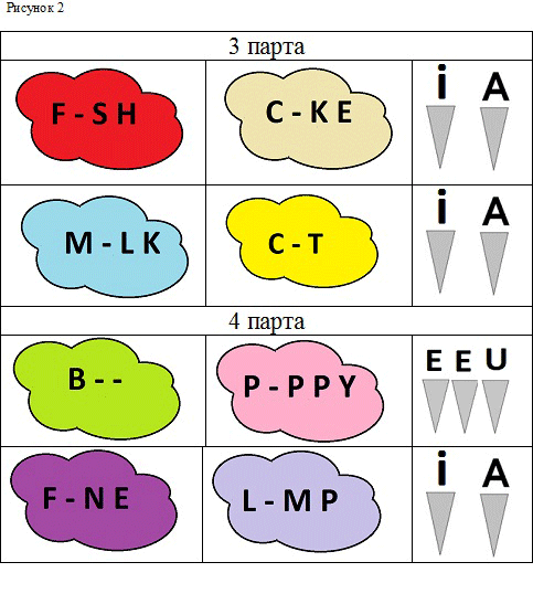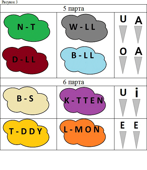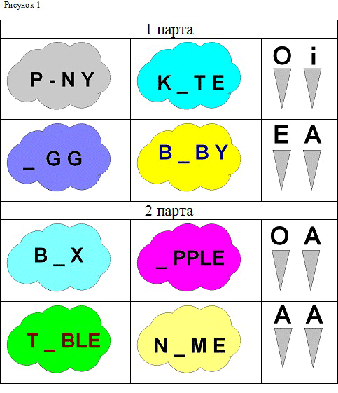 из цветного картона, размером А4, вырезаются облака. На каждое облако наклеиваются буквы, например, на синее B - L L, на красное - P - N Y , на желтое - K - T E, на черное - - G G, на зеленое - B - B Y, и т.д. Вместо одной из букв - отверстие, куда учащиеся должны вставить нужную одну или две буквы. Учащимся дается на парту 4 таких облака и 4 или более букв (в редком случае -по две, для слова B - - , например), которые нужно вставить по одной в отверстие в каждом облаке, чтобы получилось задуманное слово.