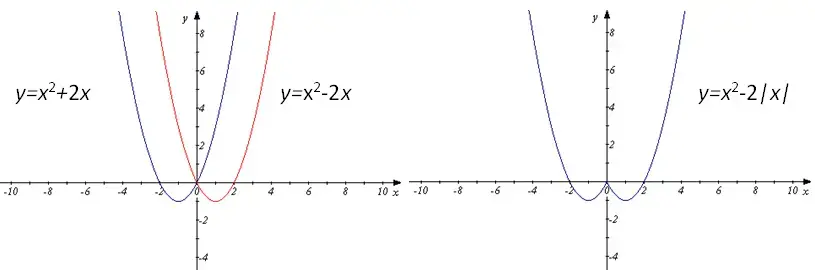 По определению модуля числа, заменим формулу y=х2-2|x| двумя, задающими зависимость переменной y от x отдельно для x > 0 и x< 0: