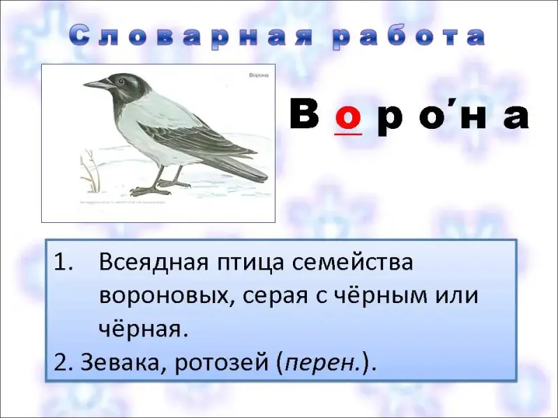 - Слово ворона - словарное, его написание мы должны запомнить. Запишите в словарики это слово. Поставьте ударение. Подчеркните безударную гласную.