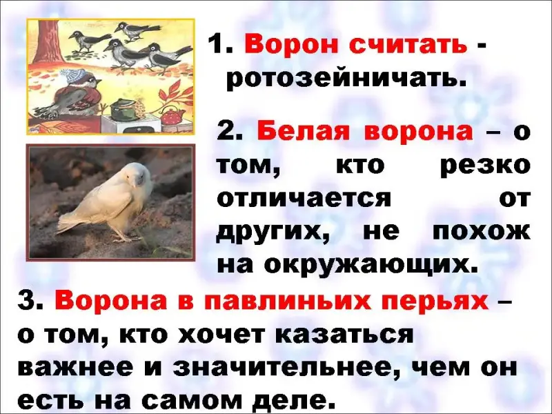 - Что они обозначают? (Ворон считать - ротозейничать. Белая ворона - о том, кто резко отличается от других, не похож окружающих).
