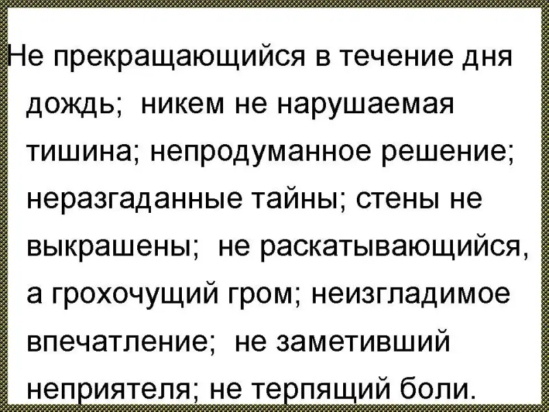 Не прекращающийся в течение дня дождь, никем не нарушаемая тишина, непродуманное решение, неразгаданные тайны, стены не выкрашены, не раскатывающийся, а грохочущий гром, неизгладимое впечатление, не заметивший неприятеля, не терпящий боли. (СЛАЙД № 10).